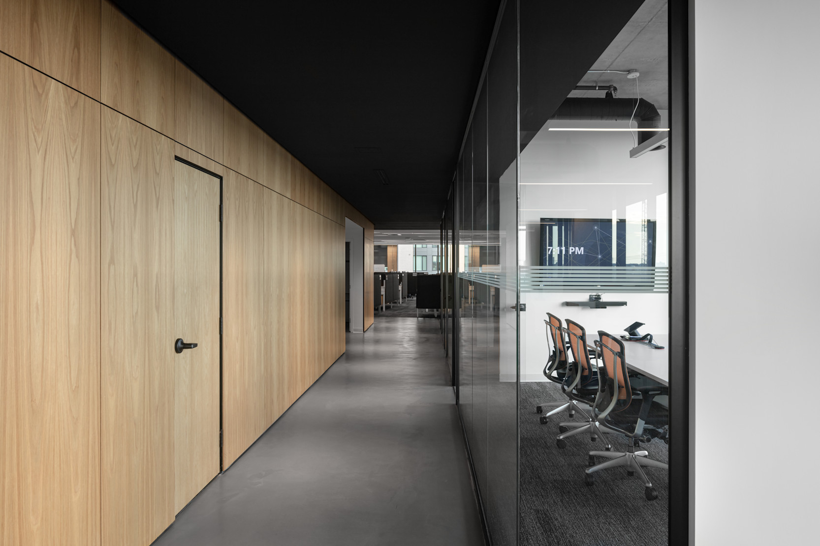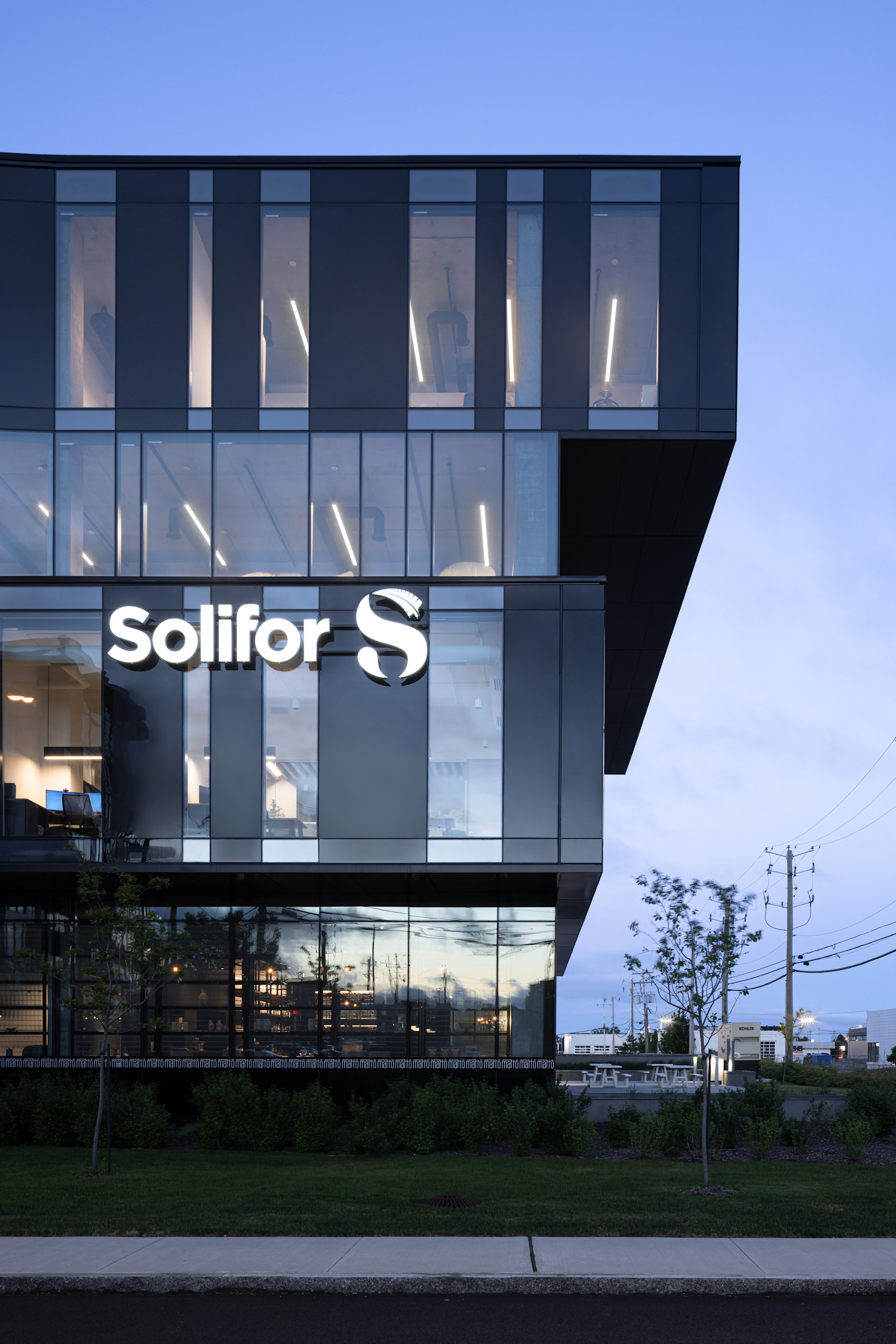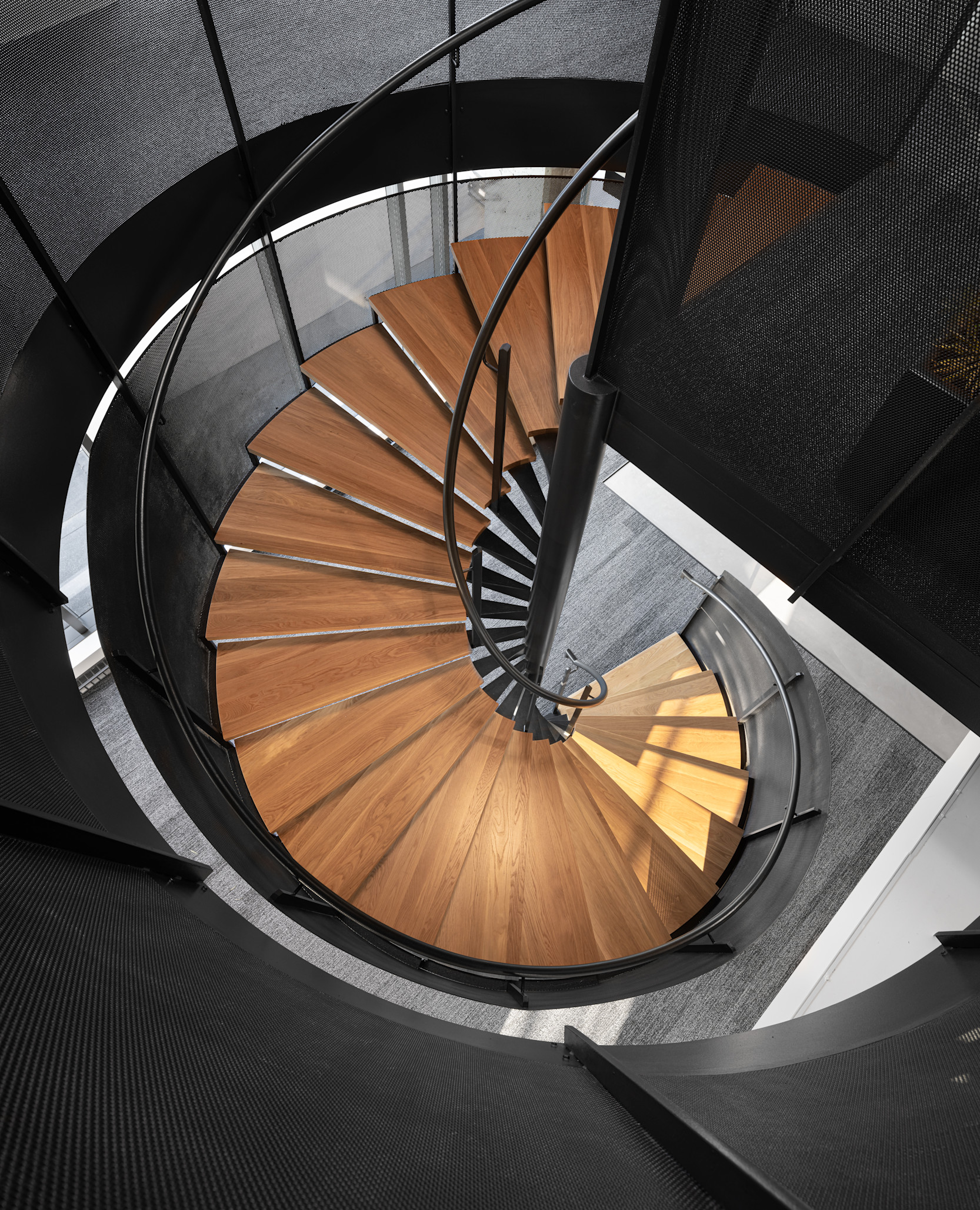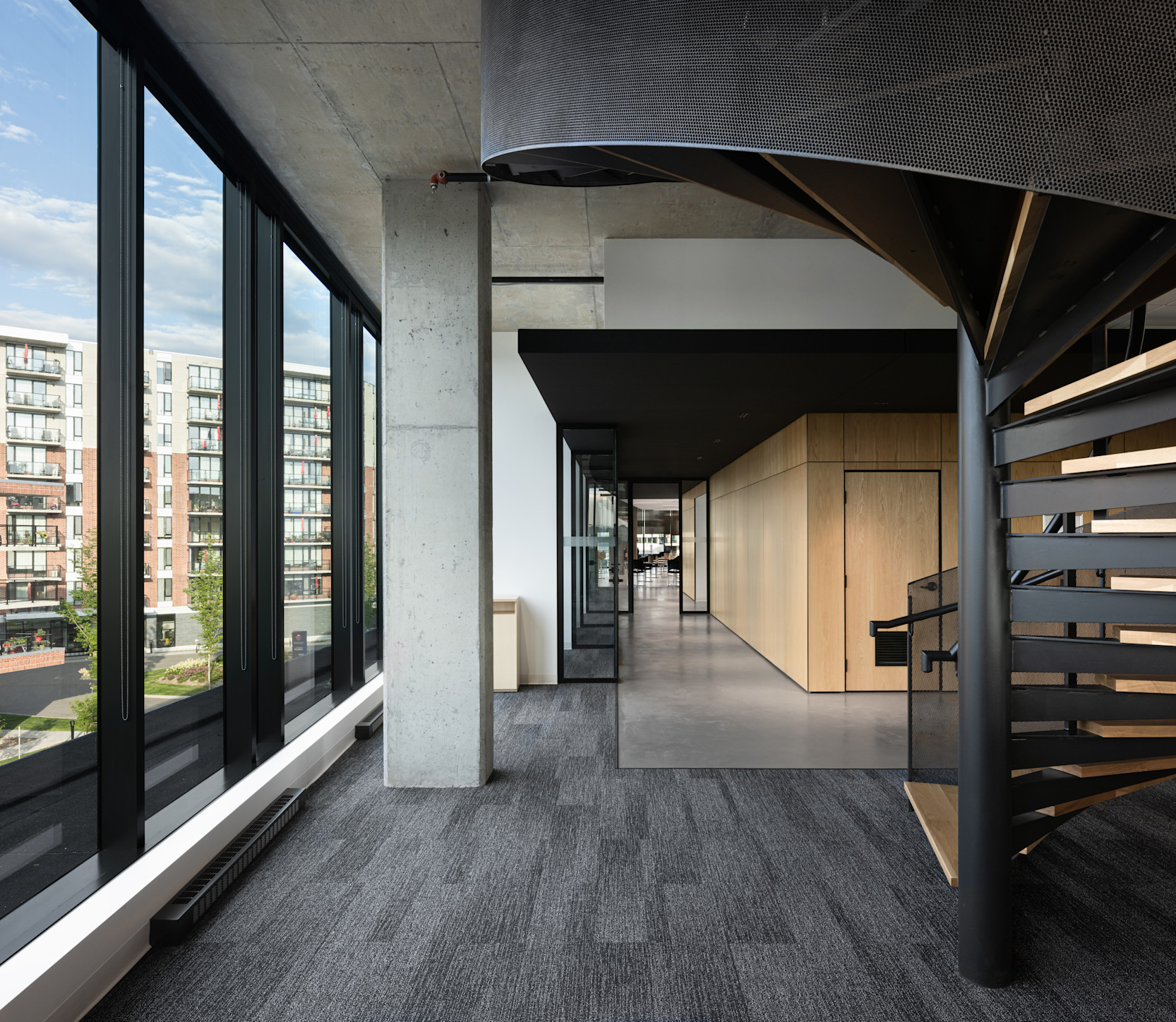 Une grande attention a été portée à la composition et au mouvement des façades, où s’alternent les zones d’opacité et de transparence. La séquence des ouvertures verticales répond à un aménagement intérieur qui démocratise l’apport de lumière qui se faufile jusqu'au coeur du bâtiment. L’organisation, d’une grande flexibilité, permet de facilement modifier l’utilisation des lieux, les salles de conférence pouvant se substituer aux bureaux ou aux aires ouvertes. Un escalier hélicoïdal central connecte gracieusement les deux derniers étages de l’entreprise.