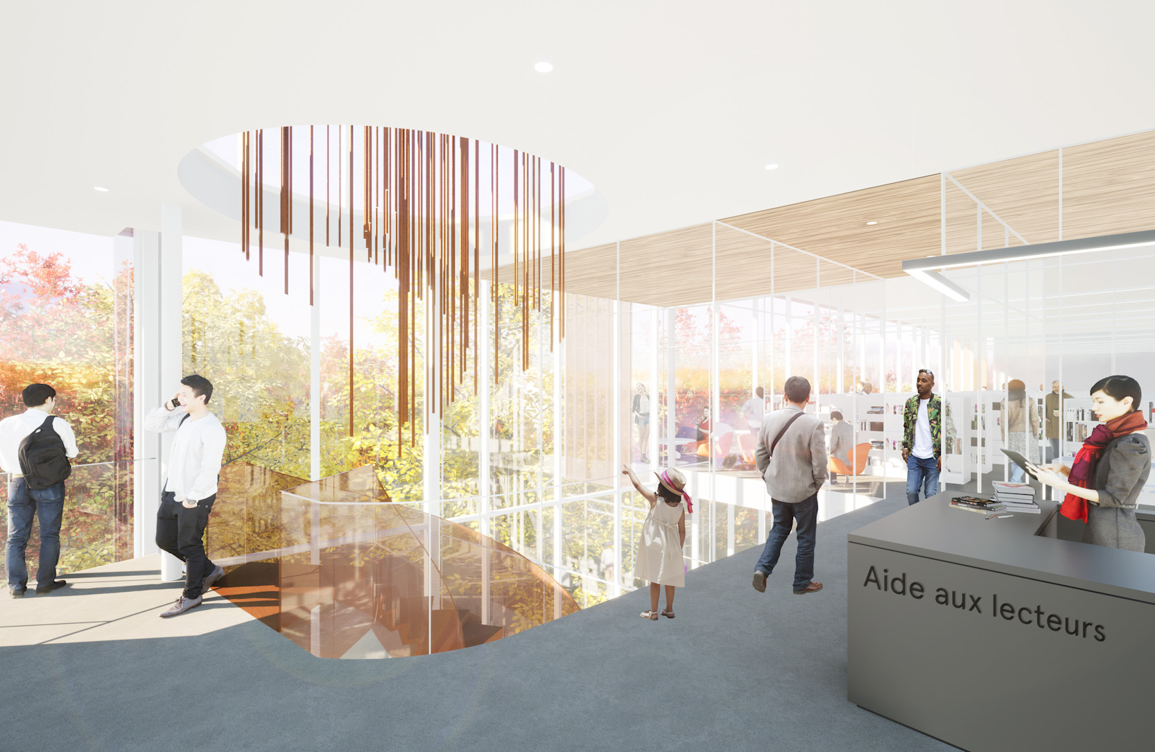Deux volumes distincts de trois étages composent l’édifice. Dès l’entrée, les usagers peuvent se diriger vers différentes zones. À gauche, se trouvent la salle polyvalente et le studio de danse, tandis qu’à droite, on accède à l’accueil de la bibliothèque et à l’espace dédié aux enfants. L'étage central comprend les espaces communautaires alors que le dernier étage est réservé à la bibliothèque, les aires de lecture, ainsi qu’un médialab et les bureaux du personnel. Ces espaces offrent des environnements lumineux, aérés et confortables favorisant l’apprentissage mais aussi un pôle de découverte pour toute la communauté.