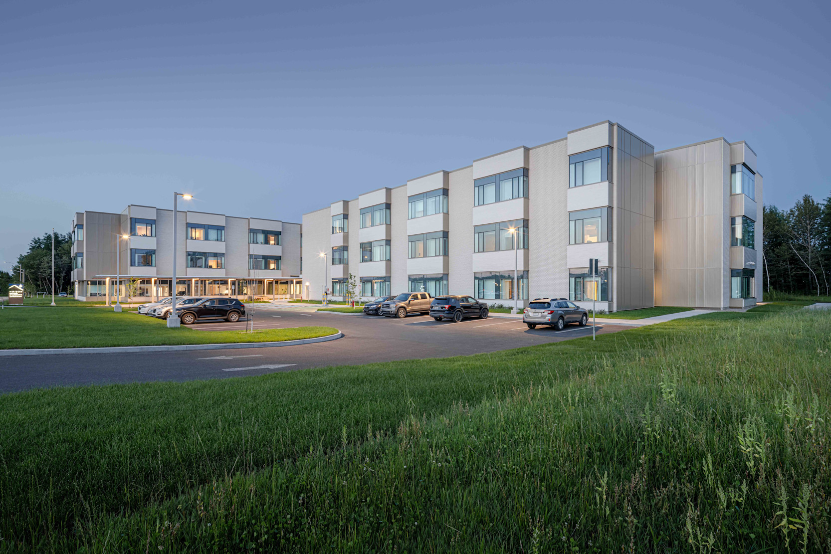 La matérialité constituée de parement de brique, de revêtement métallique vertical aux teintes chaleureuses et d'oriels en saillie assure une continuité visuelle entre les trois établissements tout en favorisant l’appropriation des lieux par leurs occupants. Ces éléments deviennent les repères d’un langage architectural sobre, cohérent et respectueux de son milieu.