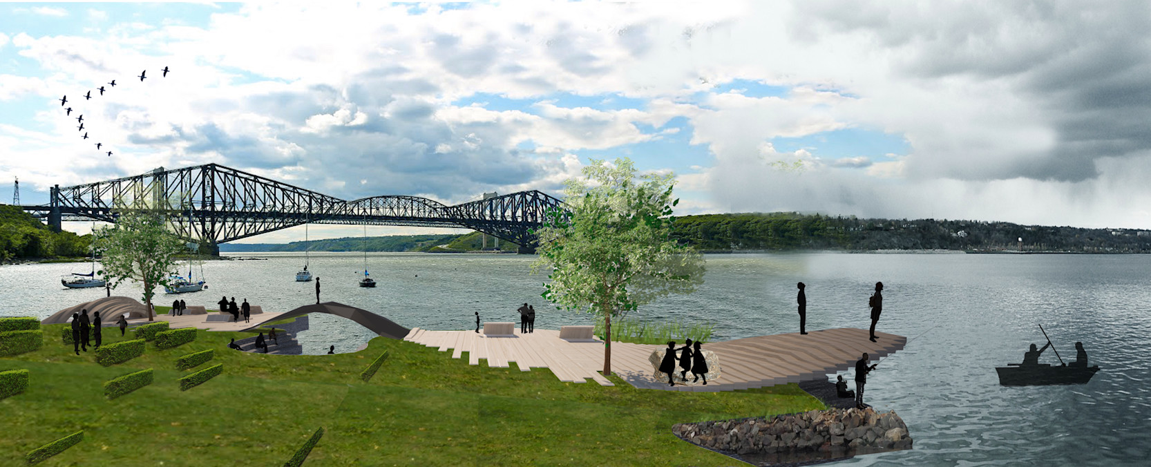 Dans le cadre du concours d’idées Paysages en dialogue, la proposition présentée s’inscrit dans une réflexion sensible sur la manière de révéler la richesse et la singularité des paysages fluviaux de la capitale nationale. Par une lecture attentive du territoire et de ses composantes naturelles, culturelles et humaines, le projet vise à mettre en valeur certains points de vue emblématiques qui jalonnent le fleuve Saint-Laurent, tout en enrichissant l’expérience du lieu pour ses usagers.