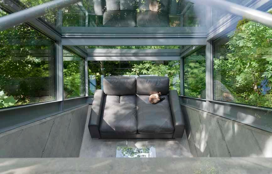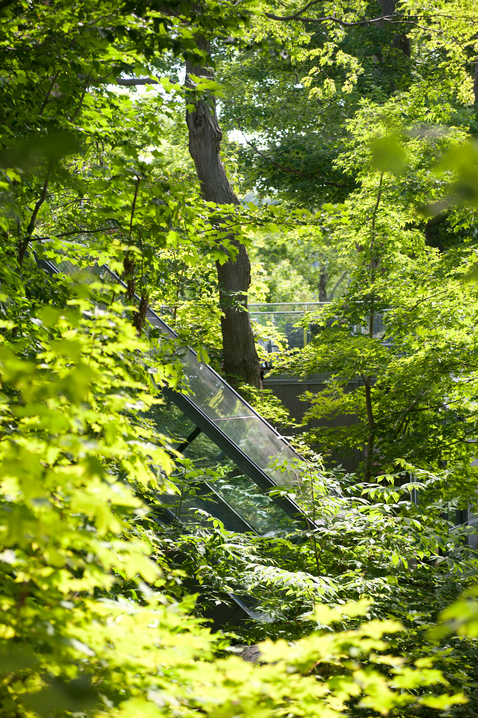 La légèreté de la structure de verre et d’acier permet à la nature environnante de s'inviter dans les espaces habités, qui deviennent des zones de contemplation. Cette transparence met en valeur le caractère mystérieux et introverti de la chapelle, qui demeure l’élément central de la composition. Elle continue d’observer silencieusement le panorama majestueux du fleuve, tout en affirmant sa présence intemporelle au cœur du projet.